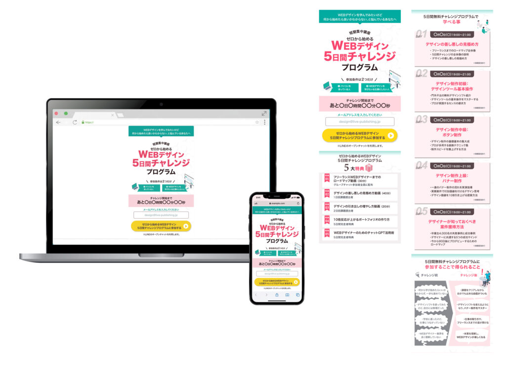 ・「Webデザインチャレンジプログラム」のタイトルが0.1秒で目に入るよう、太ゴシックでいちばん目立せました。