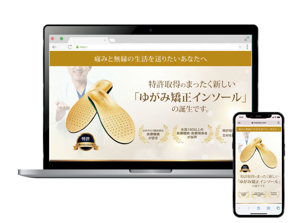 ターゲットおよび商品概要 ターゲットは老若男女。高級インソール(23,000円)の販売促進を目的としたLPの制作をお願いしたい。 クライアントさまからのご要望 ・O脚や外反母趾など足の悩みを抱えている方向け。 ・医療機関認定を強調し、信頼性と高級感を出して欲しい。 工夫した点 ファーストビューについて 【 写真素材 】 ・商品がメインのため、インソールの写真を左側に配しました。医療機関認定商品なので、背景に医師の写真を用いました。 【 文字 】 ・高級価格帯のインソールなので、明朝体を用い、商品の特徴である「ゆがみ矯正インソール」をいちばん大きな文字に。「特許取得のまったく新しい」を2番目に大きな文字にして強弱をつけました。 【 色について 】 ・高級価格帯の商品のためゴールドを基調として高級感を出しました。 【 装飾について 】 ・特許はエンブレムのあしらいを用いて重厚感を、実績は月桂樹のあしらいを用いて権威性を演出しました。 ファーストビュー以下について ・お悩み部分については、写真を用いて商品とのイメージ比較ができるよう工夫しました。 ・女性の写真を用いて、ランディングページ訪問者ご自身と重ねて共感を得てスクロールしていただけるように配慮しました。しできるように配慮。目線誘導効果で項目を読んでもらえるよう工夫いたしました。